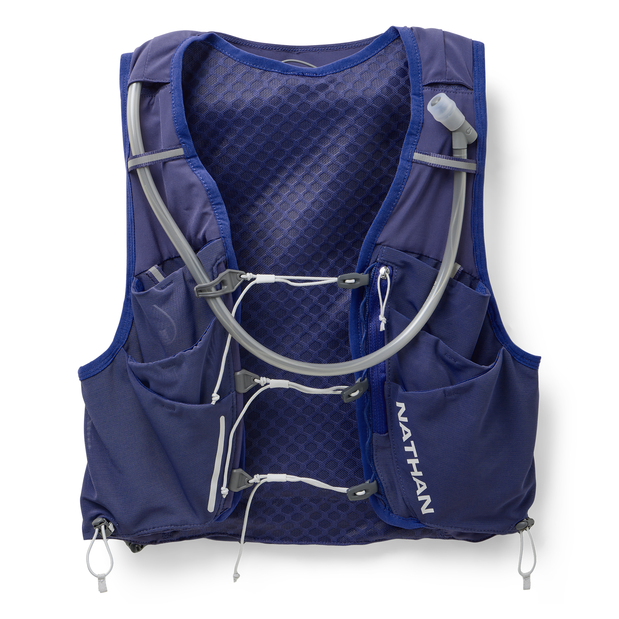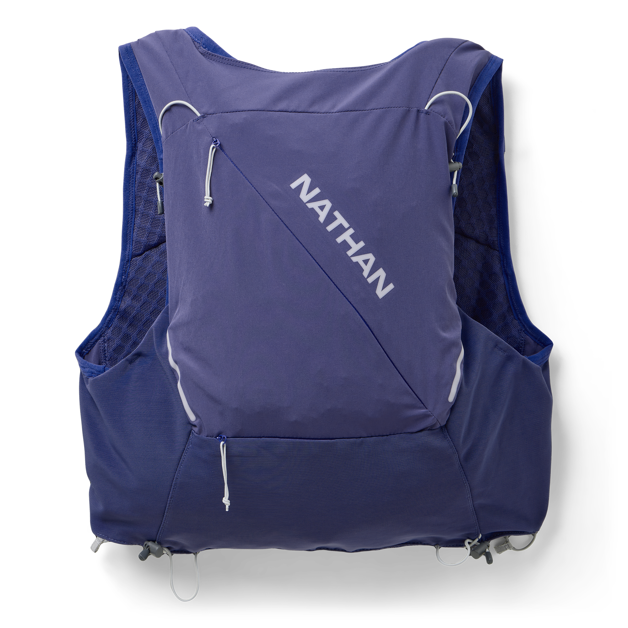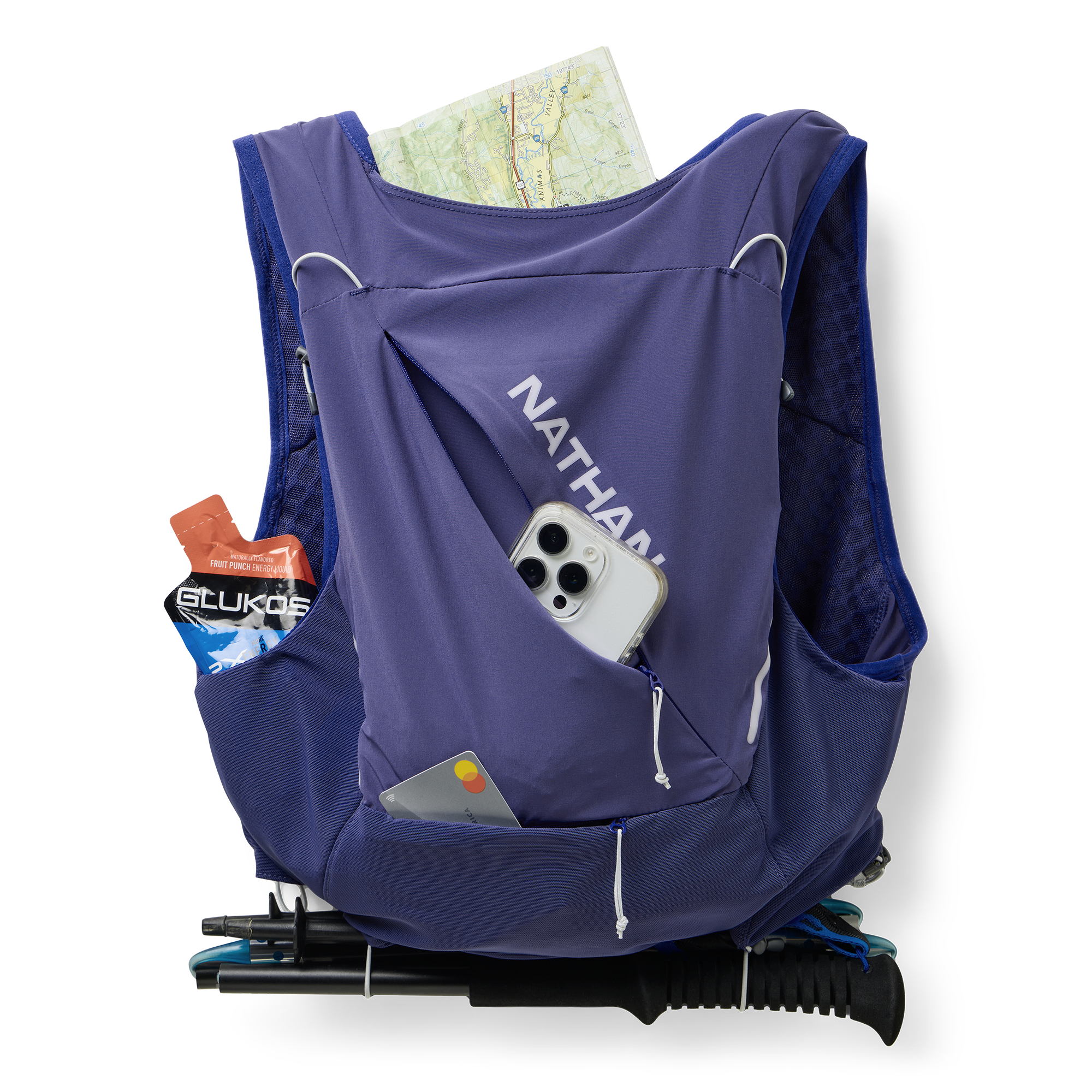 - Six power mesh pockets on front to maximize easy access storage options. Top pockets hold up to 20 oz / 592 mL Nathan x Hydrapak soft flasks with elastic cord to hold flask in place (flasks not included)