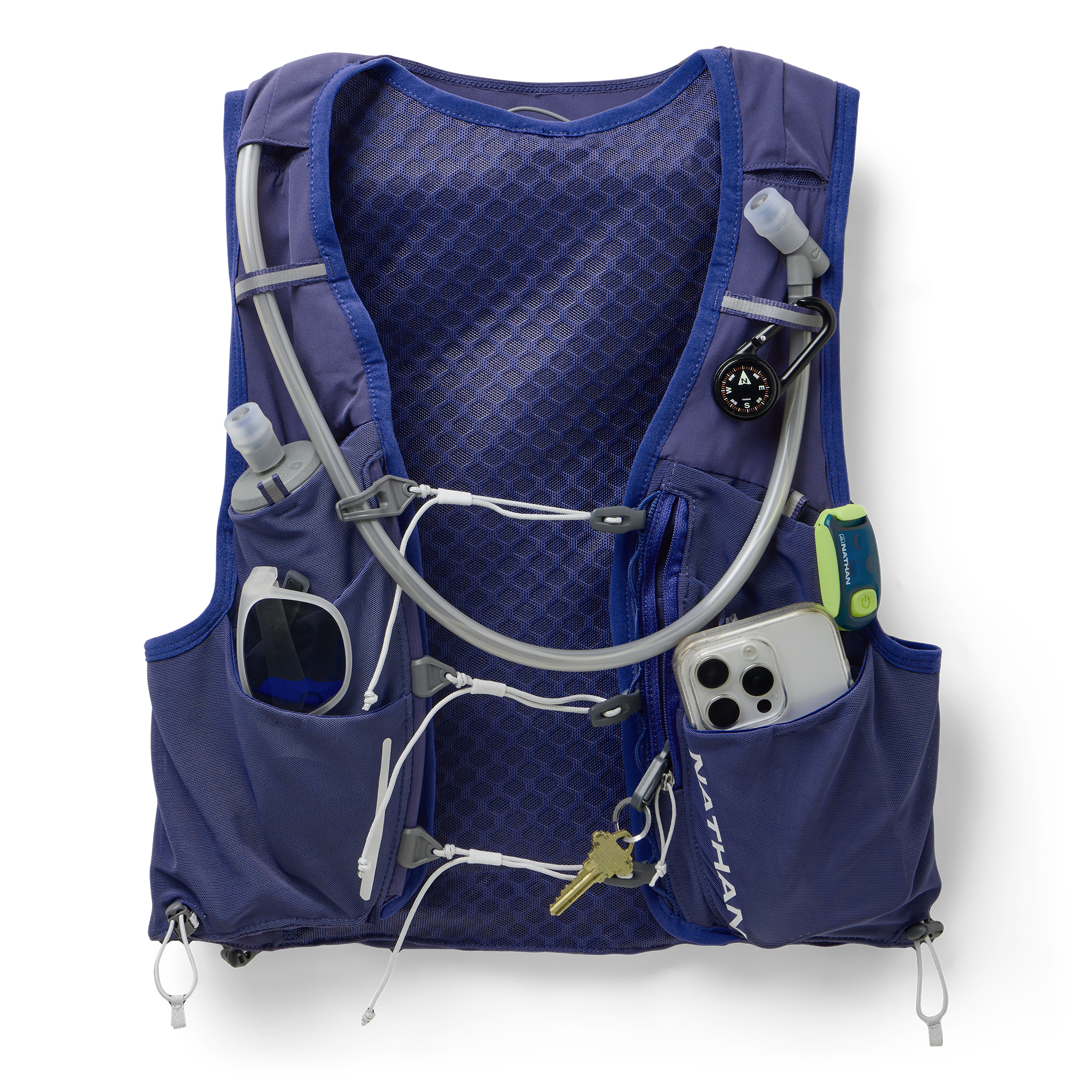 - Equipped with 1.6L Nathan x Hydrapak insulated hourglass that keeps your water colder longer and minimizes sloshing